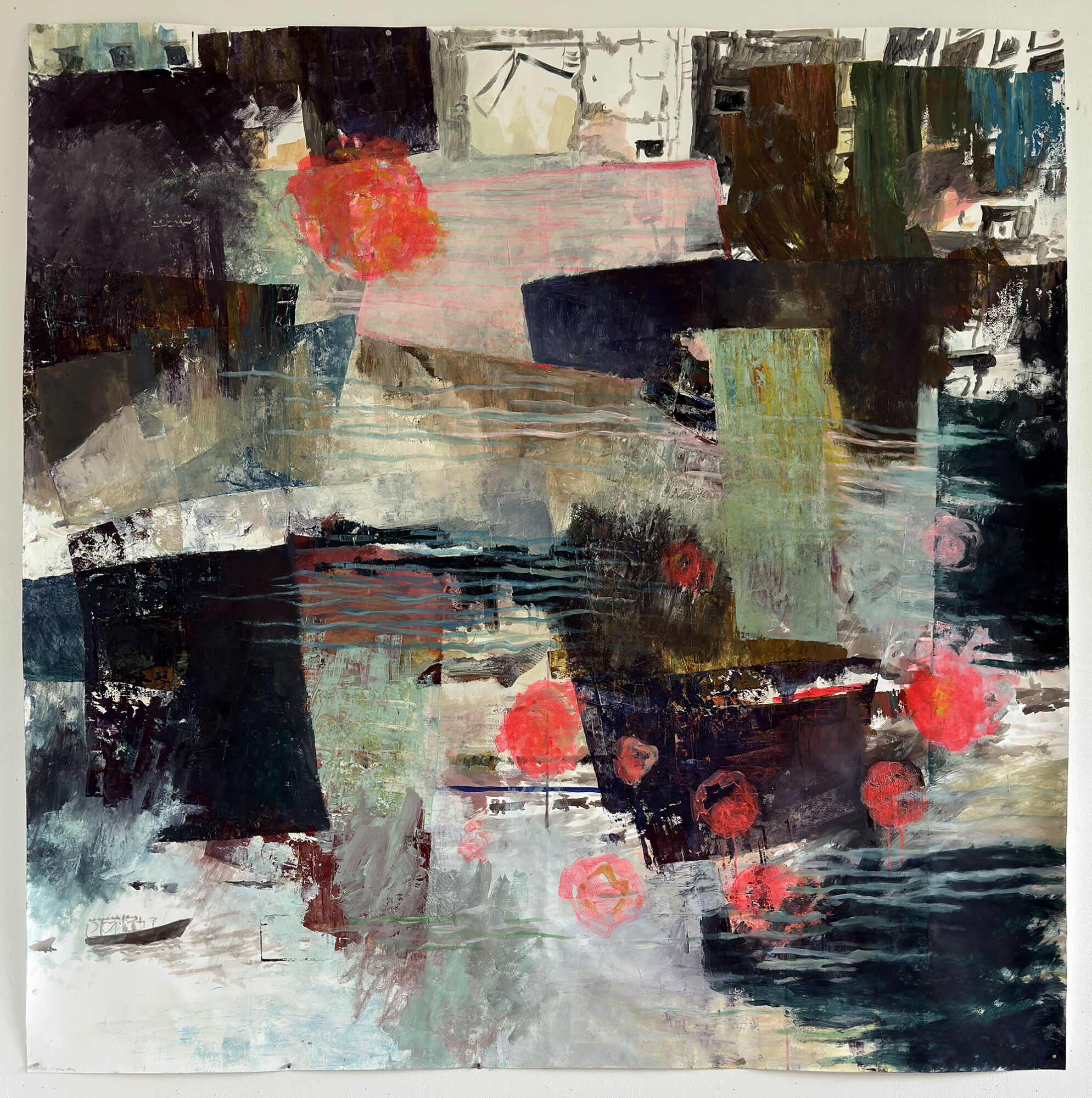 Gestirnte Buchten. | 2024-25 | 164 x 167 cm | Wachstempera, Tusche und Collage auf Papier